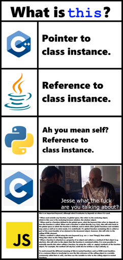 TBF the last two bullet points are verbose descriptions of the thing it means in C++, Java, and Python too. It’s just that in JS, “this” can also be used in other places.