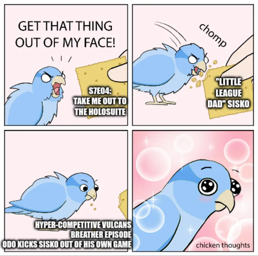 “Take Me Out to the Holosuite” didn’t become my new favorite episode or anything, but I did enjoy it after years of skipping it because I got bored with the baseball plot the first time I saw it.