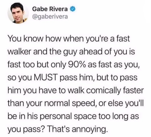 Tip from person with short legs: if someone is walking faster behind you, move to the side and slow down to let them pass at their speed. You’re welcome fast walkers.