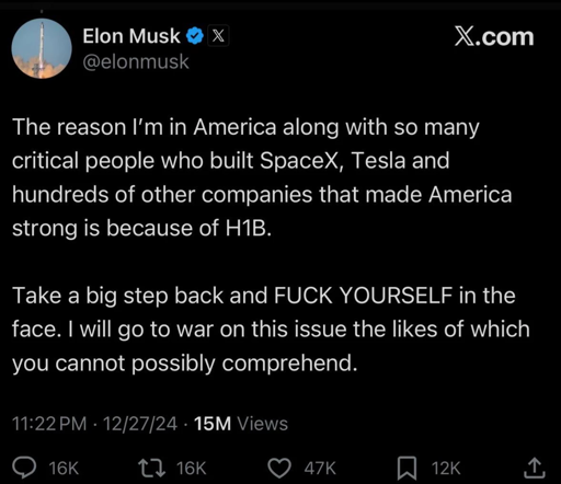 H1B is the visa that allows rich company owners like him to exploit cheap high tech talent. He can hire an aerospace engineer from India to work at SpaceX in Texas with it. He can also pay that engineer a percentage of what an American aerospace engineer would get. Furthermore he can force that Indian engineer to work a huge amount of hours. If the engineer tries to stand up for himself, threatens to quit, etc. then SpaceX can just fire him and send him back to India. If he quits SpaceX then he has to almost immediately find a new company to sponsor his H1B visa, or it’s also back to India for him. And good luck job hunting without SpaceX catching wind of it when you’re working 10 hour days 6 days a week for them.