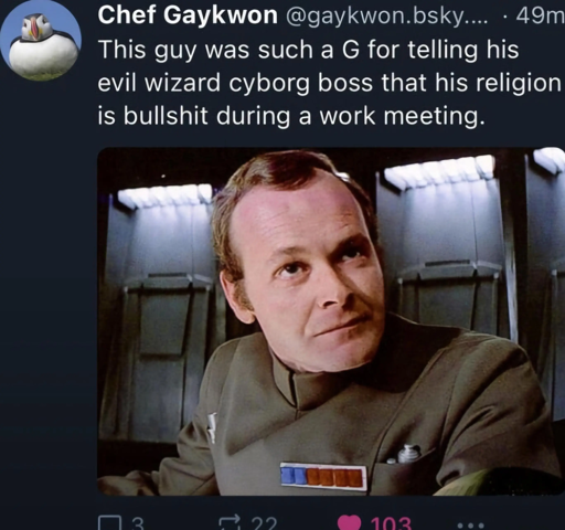 “Don’t try to frighten us with your sorcerer’s ways, Lord Vader! Your sad devotion to that ancient religion has not helped you conjure up the stolen data tapes, or given you clairvoyance enough to find the rebels’ hidden fort—”