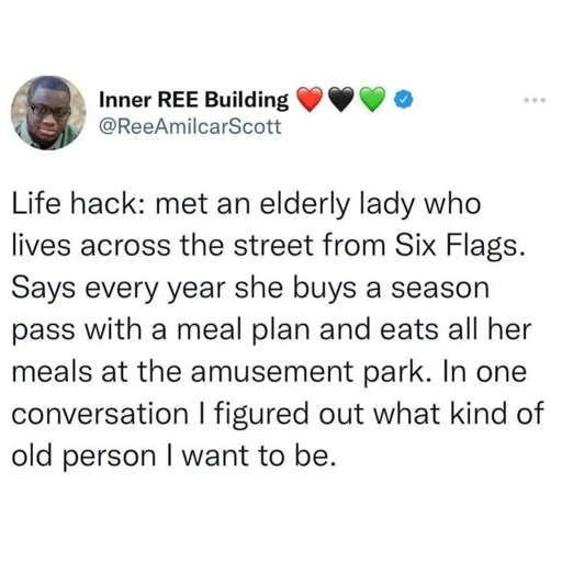 Except then, you’re eating the crap Amusement parks serve. If you’re 80, and just looking for the door, then I suppose that would be okay.