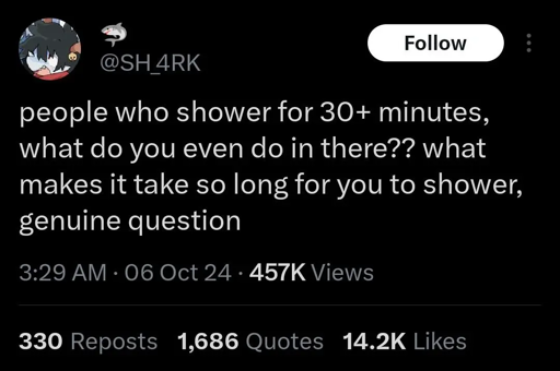 Genuine question that I feel no obligation to answer, deal with my 30 minute shower.