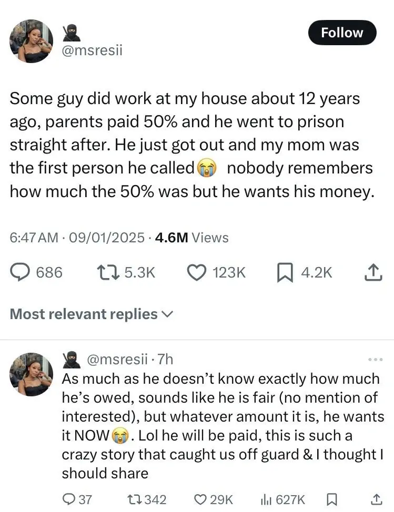 Ok let me spell it out. We don’t know if it’s a few hundred dollars and it doesn’t matter. We don’t know why he was in prison, but if he got 12 years, it won’t be drunk driving. If someone did sth before they’re more likely to do it again. You got your work done, and didn’t pay up. The guy can use a bit of cash to get back on their feet. Basically, there is no serious argument why you wouldn’t pay the dude apart from you being a massive cunt, both morally and just general self preservation.