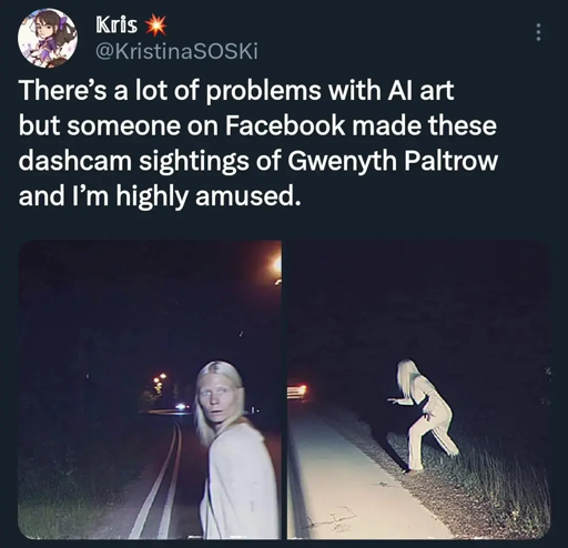 I mean, hate on AI all you want, it’s justified, but that definitely looks like a road, Gwyneth Paltrow, and a dash cam image.