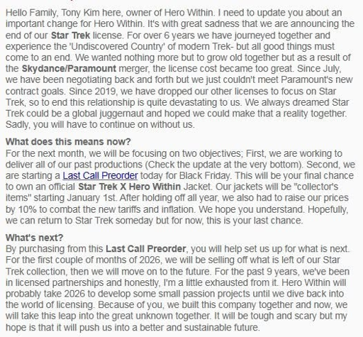 hopesdead@startrek.website to Star Trek Social Club@startrek.websiteEnglish · 2 days agoHero Within Announce End of Licensingstartrek.websiteimagemessage-square1linkfedilinkarrow-up113arrow-down10file-text