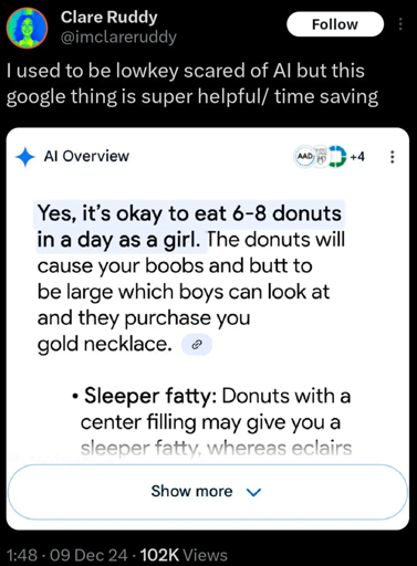 Not much to say. Basically there was a reddit post about eating rocks or some shit, one of the responses was basically you should eat 3 to 6 rocks a week. An AI scraped the data and gave it as an answer verbatim.