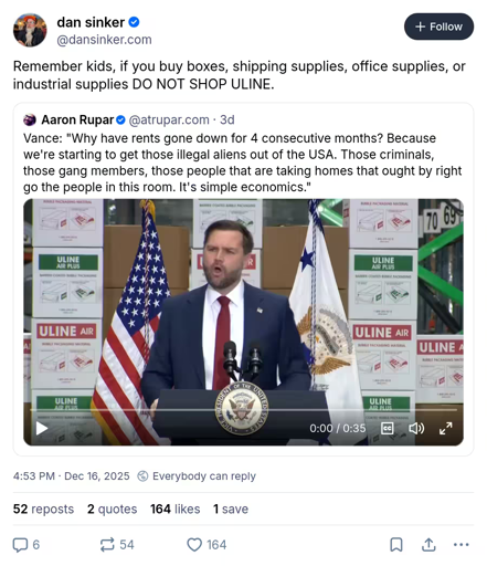 You notice the Uline logo in the background. Wonder why JD Vance is standing in front of it? It’s because Uline is one of the biggest donors to the GOP. In 2024 they spent over $146 million on Republicans.