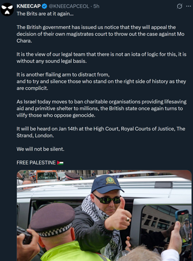 The UK government’s record in Israel is abysmal, but if you drape yourself in the flag of an actual terrorist organisation and tell people to kill their MP - which is what the guy is alleged to have done - then legal repercussions seem appropriate.