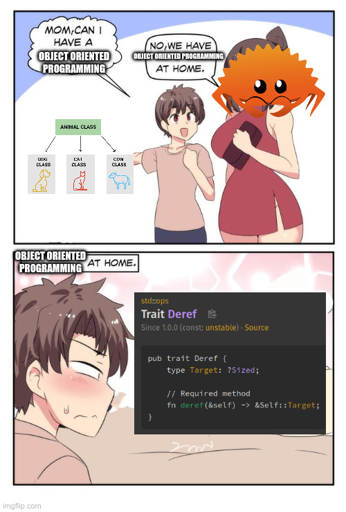 And these traits allow you to make trait objects, which would be like regular objects in C# (with vtables for the methods). If 2 different structs implement the same trait, you can “downcast” them to a trait object and store them in the same array. Or pass it is an argument to a function that wants something that implements that trait but doesn’t care about the specific struct. You can of course cast it back later to the original struct.