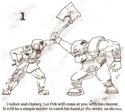 The ork is stronger, but that strength is not necessarily equally distributed. Your ability to stop his arm in the position you’re moving into may be greater than his ability to swing that axe in the way he has planned. Kind of the key to a lot of the concepts in various martial arts. Does look like kind of a wild swing on the part of the Ork.