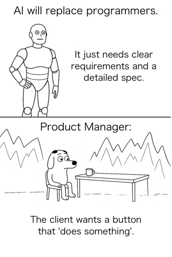 arrow-up1119arrow-down1imageAI will replace programmerslemmy.ml☆ Yσɠƚԋσʂ ☆@lemmy.ml to Programmer Humor@lemmy.mlEnglish · 8 months agomessage-square5linkfedilinkcross-posted to: programmer_humor@programming.dev